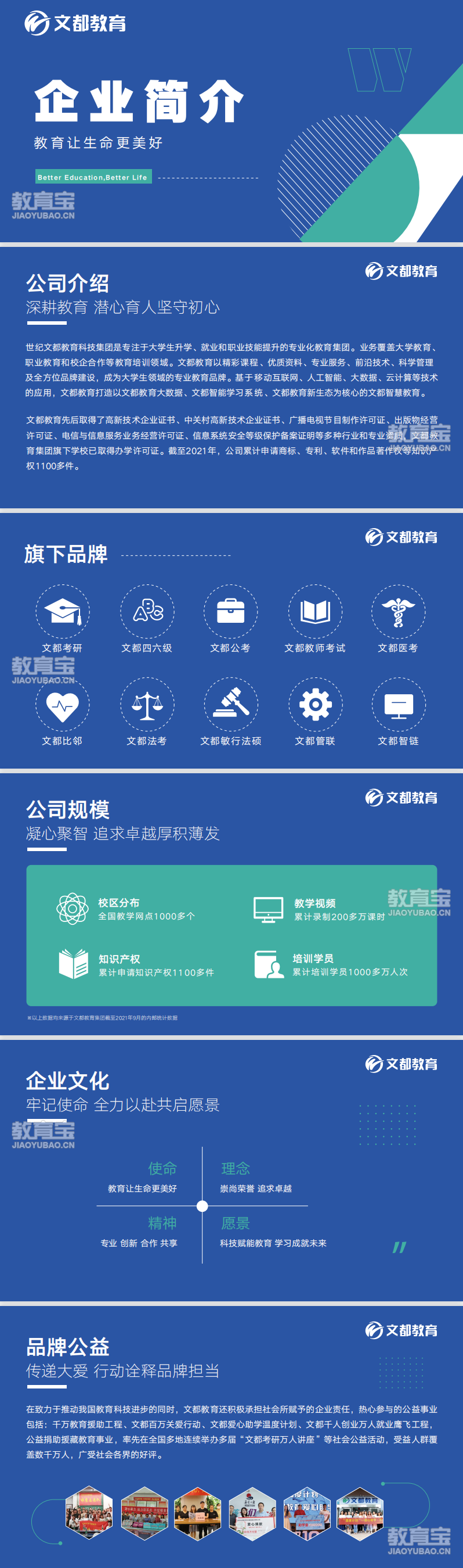 世纪文都教育科技集团是专注于大学生升学、就业和职业技能提升的专业化教育集团。业务覆盖大学教育、职业教育和校企合作等教育培训领域。文都教育以精彩课程、优质资料、专业服务、前沿技术、科学管理及全方位品牌建设,成为大学生领域的专业教育品牌。基于移动互联网、人工智能、大数据、云计算等技术的应用,文都教育打造以文都教育大数据、文都智能学习系统、文都教育新生态为核心的文都智慧教育。